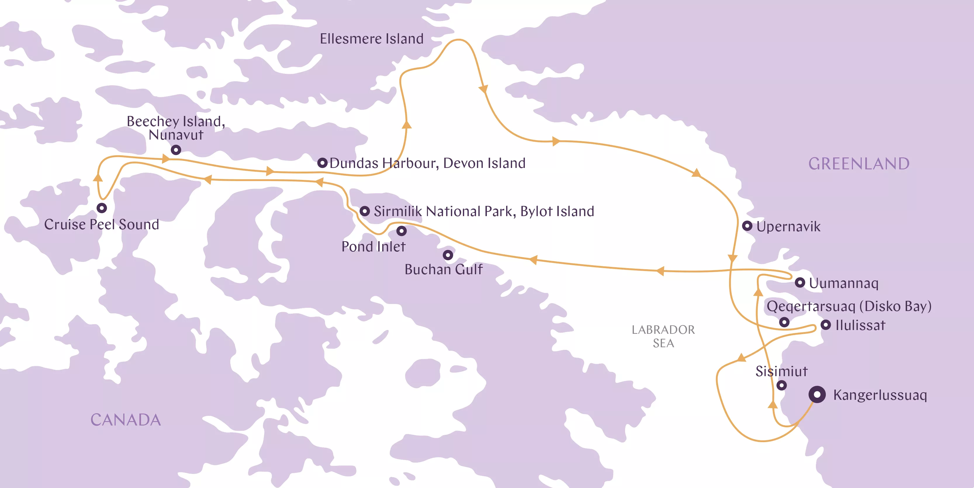 Voyage on this unforgettable 17-day High Canadian Arctic Discovery cruise that circles around Baffin Bay among mountainous icebergs and some of the most active glaciers in the world. We visit UNESCO World Heritage sites, Inuit communities and Viking ruins in a history lesson like no other. Witness polar bears roam and be enchanted by a blessing of narwhal dive before you, then glimpse long white tusks break the icy arctic waters.