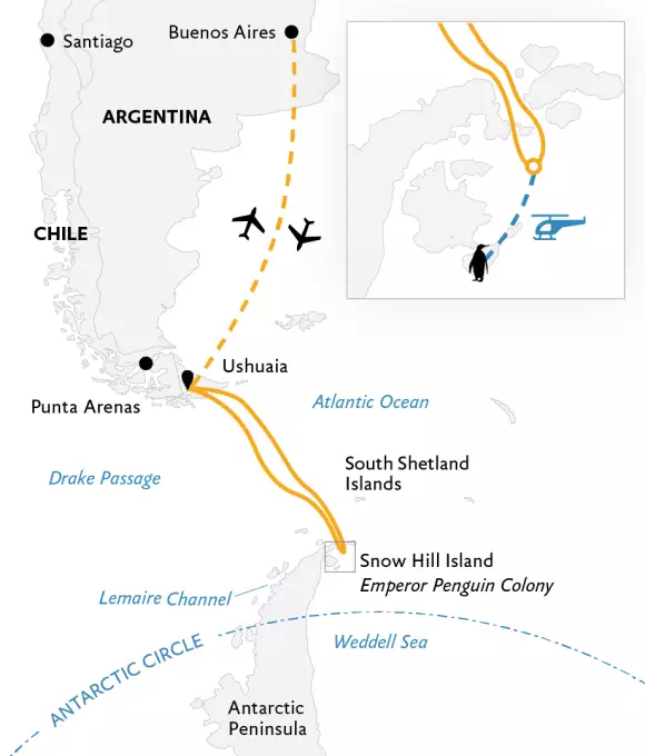 This is one of the most exclusive wildlife viewing experiences on the planet. We invite you to embrace the thrill of the search as we once again set out to visit to the emperor penguins at Snow Hill Island. Experience a true polar quest as we journey on our new ship, Ultramarine, which is equipped with two twin-engine helicopters that will fly guests to the vicinity of this rarely-visited rookery, whereupon they will walk across the thick sea ice to stand within metres of the most coveted penguin species on the planet. Anticipate scenes reminiscent of “March of the Penguins” and BBC’s “Frozen Planet.” Just imagine the penguins tobogganing across the ice towards the sea. Such wildlife moments are too precious for words!
