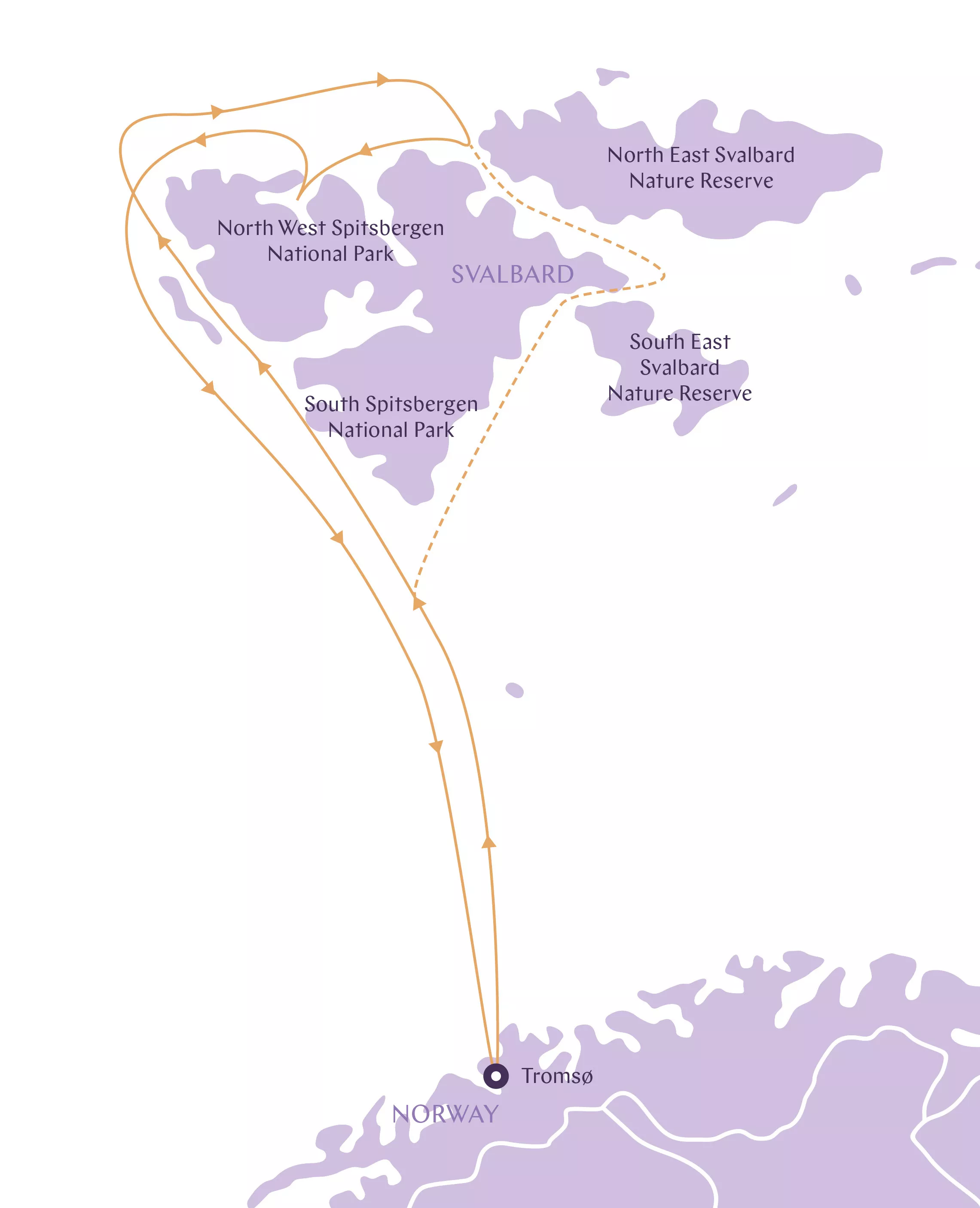 Spend 11 days exploring the Svalbard archipelago. See large haul-out sites of walrus, closely watched closely by stealthy polar bears. We cruise to the world’s northernmost settlements, take in the views of vast glaciers where beluga swim under the midnight sun, and listen out for cracking sounds as huge icebergs calve into the deep and beautiful fjords.